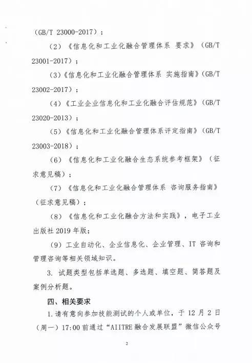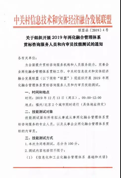 为全面提升贯标咨询服务机构和人员服务能力,完善企业两化融合管理体系贯标工作,中关村信息技术和实体经济融合发展联盟(以下简称“联盟”)现组织开展2019年两化融合管理体系贯标咨询服务人员和内审员技能测试。通知如下: